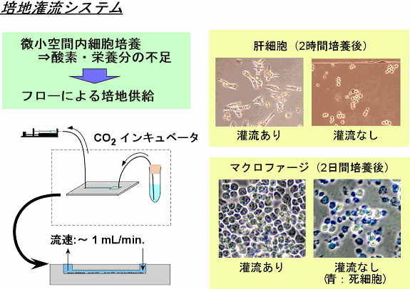 通常のシャーレやフラスコなどを使った細胞培養では4〜5 mm程度の厚さに培地をはり、その上は解放され空気と接触する形で培養する。これによって細胞は十分な栄養分と酸素を得て、さらに不要な老廃物が希釈されていくことによって生命を維持している。それに対して、培養槽をマイクロチップの内部にマイクロチャネルと同じような大きさで作製した場合には、培養槽は例えば深さ0.1 mm程度の閉じた空間になる。このように狭く閉鎖的な環境で静置培養を行った場合には十分な物質供給がなされない可能性がある。こういった問題を解決する手段として、図2のようなフローシステムを採用し、マイクロチャネルを通じて新しい培地を絶えず供給することによって培養槽全体にわたって良好な細胞培養を目指した。