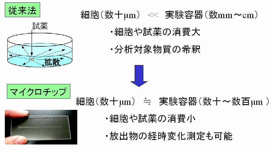 通常、現在では、培養細胞を用いた研究には直径数cmのシャーレや直径数mmのウェル(小さな容器)が並んだマイクロタイタープレートと呼ばれるポリスチレン製の容器が用いられる。これらは人間からみて扱いやすいという観点のみから大きさが決められているため、サブミクロンオーダーの細菌や数十ミクロンオーダーの高等生物の細胞から見れば不必要に大きい入れ物になっており、単一細胞や可算個の細胞を取り扱う実験には適切とは言えない。それに対して、数ミクロンから数百ミクロンオーダーの大きさを持った構造物からなるマイクロチップは、細胞を取り扱うために適したデバイスになりうると容易に想像できる。